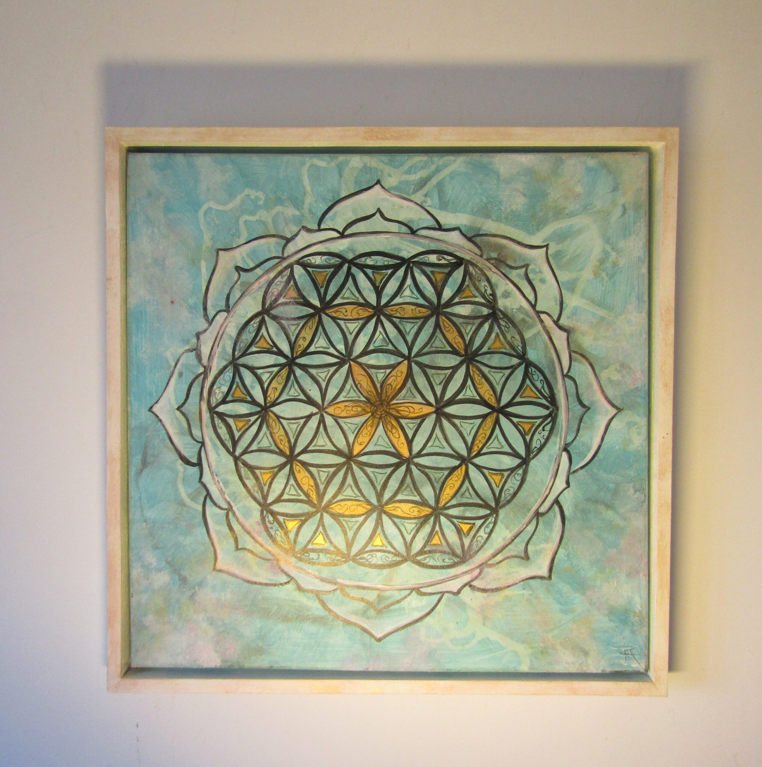 Contrairement à la rigueur habituelle du trait, j’ai choisi d’immerger ces symboles dans des fonds colorés et bigarrés. Ces explosions de pigments représentent le tumulte de nos existences, la richesse de nos émotions et la matière brute du monde. Au milieu de ce foisonnement, la Fleur de Vie émerge comme une structure apaisante, une boussole pour l’esprit.