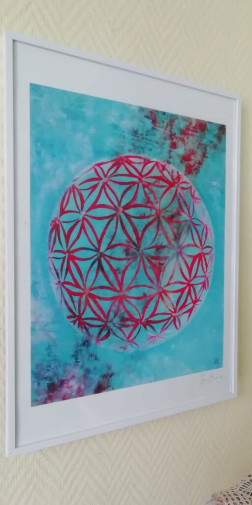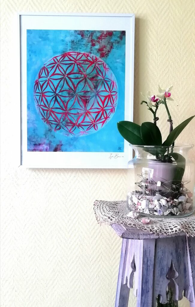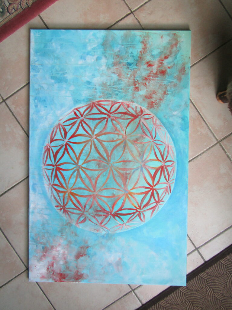 - Orion & Celeste : L’Infini. Ici, la Fleur de Vie se déploie comme une constellation. Ces toiles invitent à la connexion avec le macrocosme, rappelant que le Nombre d’Or régit aussi bien les galaxies que nos propres cellules.